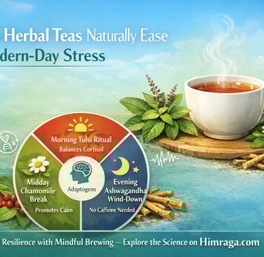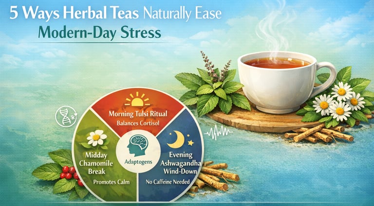 Tulsi, or holy basil, acts as an adaptogen to help regulate cortisol, the body's primary stress hormone, by supporting the HPA axis for better resilience during high-pressure days. Chamomile contains apigenin, which binds to brain receptors to promote GABA activity, fostering calm and reducing anxiety symptoms in studies on regular consumers. Ashwagandha has shown reductions in cortisol by 11-32% in clinical trials, enhancing sleep quality and breaking the cycle of stress-induced fatigue.